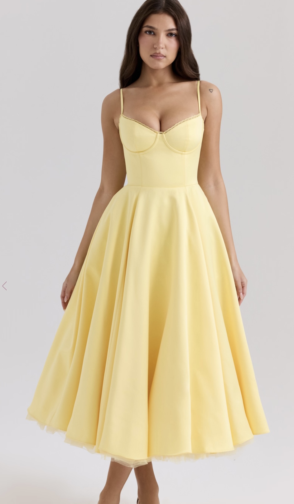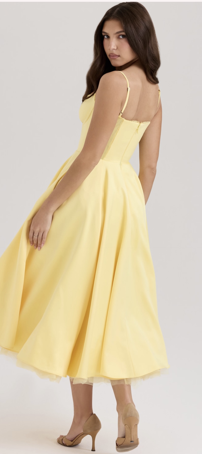 Uszyta z lśniącej satyny księżnej z nutą powermesh, nasza sukienka „Mademoiselle” to kwintesencja bajek. Gorset jest idealnie usztywniony, aby podkreślić talię, i ma ładny dekolt w kształcie serca z fiszbinami. Delikatne ramiączka dopasowują się idealnie, a „Mademoiselle” to przede wszystkim zwiewna spódnica midi, wyposażona w obszerną warstwę najdelikatniejszego tiulu, co zapewnia oszałamiający wygląd, który pięknie zachowuje kształt. Uwielbiamy, że ma kieszenie. Opcja miseczki „Regular” pasuje do rozmiaru miseczki A-C